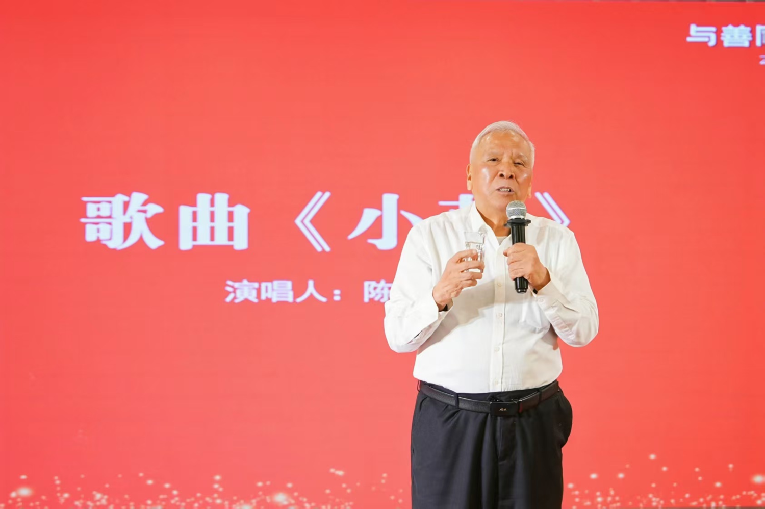 晚会现场特设乡村儿童画作展览区,80幅充满童真与梦想的画作构成一道温暖的风景线。在义卖环节,这些作品被志愿者精心放置于每张餐桌旁,形成“移动的微画廊”,让嘉宾在晚宴交流之余,能近距离感受孩子们笔下的世界,并随时扫码认捐,将艺术之美直接转化为爱的助力。 05 薪火相传,八旬“少年”再唱《小草》 晚会的最高潮属于基金会名誉理事长、86岁的“公益长征者”陈开枝主席。他分享了自己光脚求学、二十岁才穿上第一双鞋的往事,并再次强调 “慈善的不是钱,是心”。