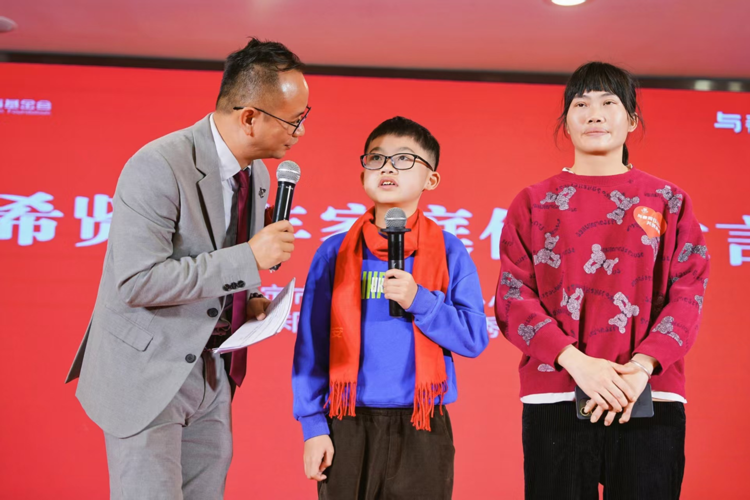 基金会与广州印小生、华农大营养食品等合作企业代表共同启动该计划。无锡相守国医馆有限公司、福建麦悠悠农业科技有限公司、宁德食材典评有限公司、北京蝶潮云计算科技有限公司、北京俏泊文化传媒有限公司、中山市正潮传媒有限公司、广东谷语供应链有限公司等爱心企业积极响应消费捐计划。 03 温暖共鸣,从受助者到传承者 最动人的环节来自项目受益人的真实分享。来自云浮罗定的“希贤少年”郑楚伟和妈妈黎春秀走上舞台,讲述他们的改变。 “志愿者哥哥姐姐经常来陪我写字、讲故事,我现在更爱上学了。”楚伟稚嫩的声音里充满阳光。黎妈妈则哽咽表示:“‘智慧父母’课堂让我学会了怎么和孩子沟通,感觉不是一个人在硬撑,有了方向,也有了希望。”